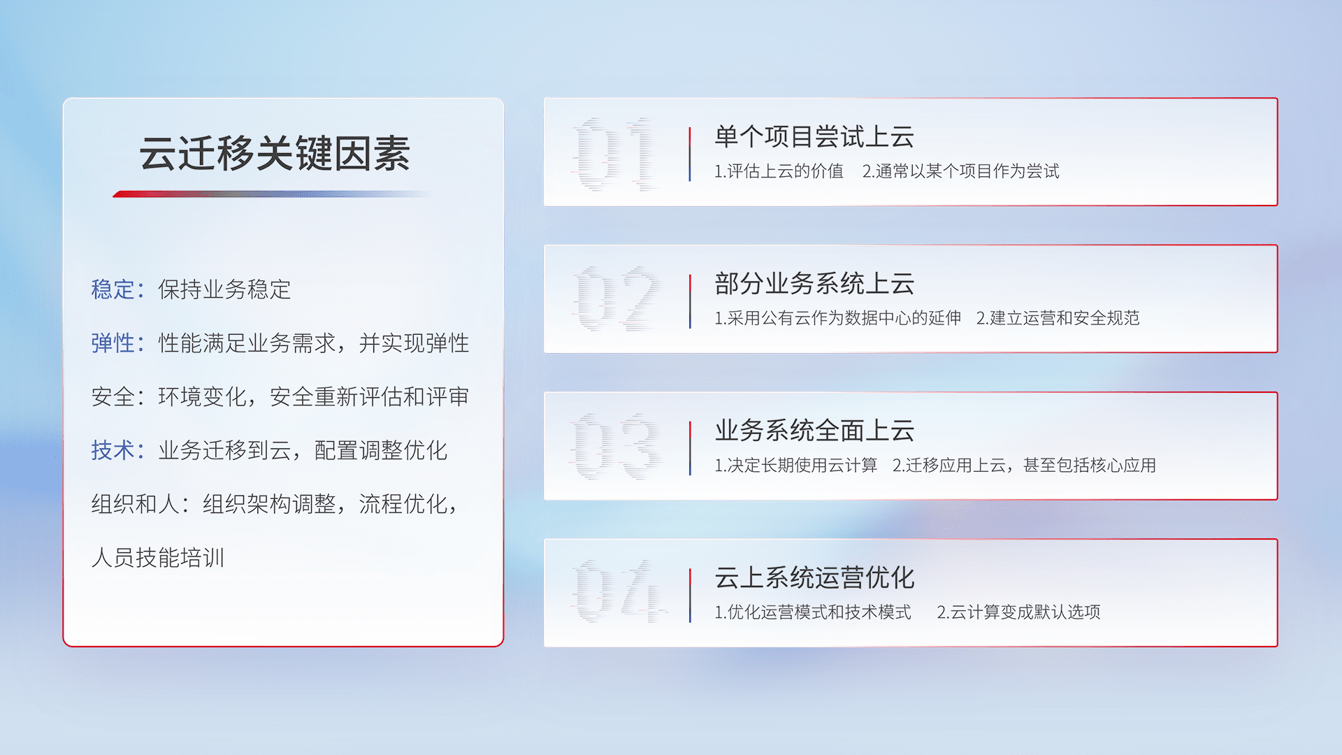 结合实际业务,,,,从规划设计、、、、云平台选型、、云原生改造、、、、数据迁移、、、、集成交付,,迁移全过程为客户识别最佳上云路径,,做好风险识别管理,,,,设计网络架构、、身份权限、、、安全审计合规、、、、操作审计、、、日志审计、、、监控告警策略、、多站点容灾设计等,,,,对云上基础设施进行整体规划,,提升IT治理水平,,,,以满足弹性、、、高可用、、高性能的需求。。。