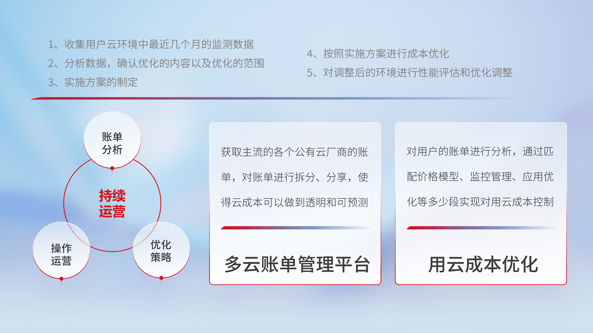 通过多云纳管,,,,以统一的资源数据模型把客户的云资源进行抽象和封装,,,,进而实现对多云资源的统一操作,,,保障云资源管理的可靠性、、、、稳定性与可用性。。。量身定制化运维内容,,,,配置、、开发运维、、、补丁管理、、、、备份、、、监控、、、、认证和访问管理、、、、审计和日常巡检等,,保障在用云过程中的可靠度,,,稳定度以及高可用率。。
